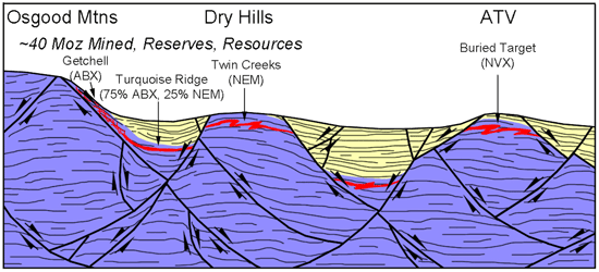 (Figure 1: Schematic section through the Osgood Mountains to the ATV project, looking northeast. Structural modeling by NV Gold suggests favorable sedimentary host rocks for Carlin style mineralization potentially underlie the ATV project at shallow depths. A thin veneer of young gravels and volcanic rocks (yellow) overlie Paleozoic sedimentary rocks (purple). Red indicates gold mineralization or potential gold mineralization at ATV. Depth to favorable rocks is thought to be within a few hundred meters of surface within much of the ATV project area.)