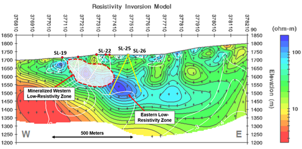 “I am very pleased that the “Low-Resistivity Model” has confirmed that alteration and related gold mineralization correlate extremely well with the low resistivity zones. All the reverse circulation holes drilled into the eastern low-resistivity extension have intercepted the same type of silicification and oxidation, suggesting that width of the Slumber gold system now appears to exceed half a kilometer (see Figures 1 & 2). NV Gold is also conducting a mercury-vapor survey which will be supported by additional biochemistry sampling to assist in locating potential higher-grade feeder structures.” commented Thomas Klein VP Exploration NV Gold.