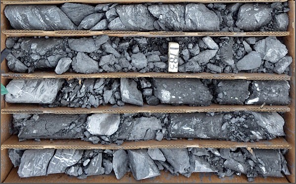 (Figure 1: Core from hole ARC-6A from approximately 1780-1790 feet [542.7-545.7 m]. Upper left is the beginning of the interval and the lower right is the bottom. Core diameter is approximtely 7 cm. Crumbly, broken, decalcified muddy and silty sedimentary rocks thought to belong to the prospective Comus Formation. White veinlets are composed of late-stage calcite.)