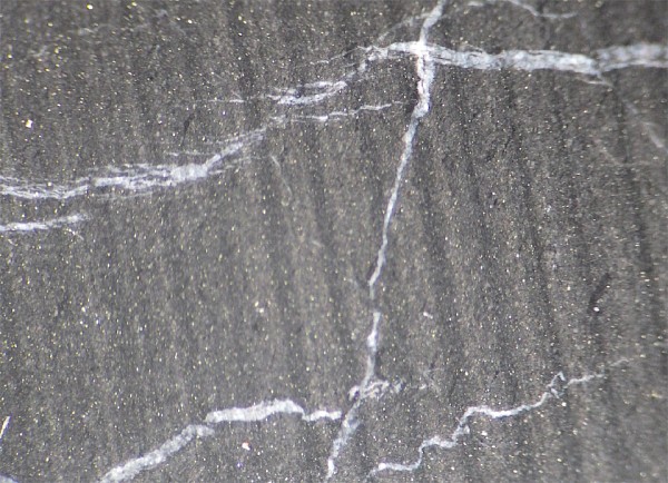 (Figure 2: Photomicrograph of core from hole ARC-6A from a depth of approximately 550 m. This is interpreted to be decalcified silty limestone thought to belong to the prospective Comus Formation. White veinlets are late stage calcite veins. Note very fine disseminated pyrite, small points of yellowish white, scattered throughout.)