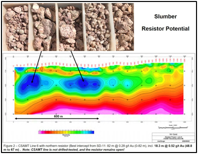 The primary CSAMT-interpreted targets, where NV Gold was targeting a potential “Sleeper-type” gold system at Slumber, remain untested.