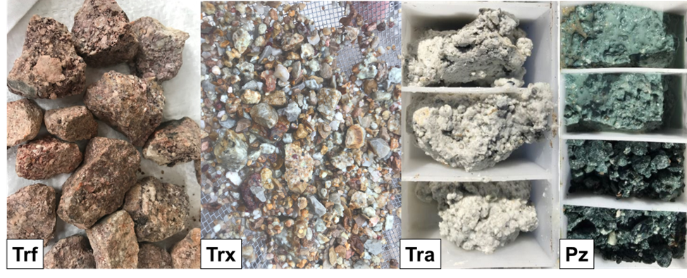 Figure 2 - Rock types at Slumber (Trf and Trx are the main host rocks for gold, while Tra can be weakly gold anomalous, and Pz is mostly barren).