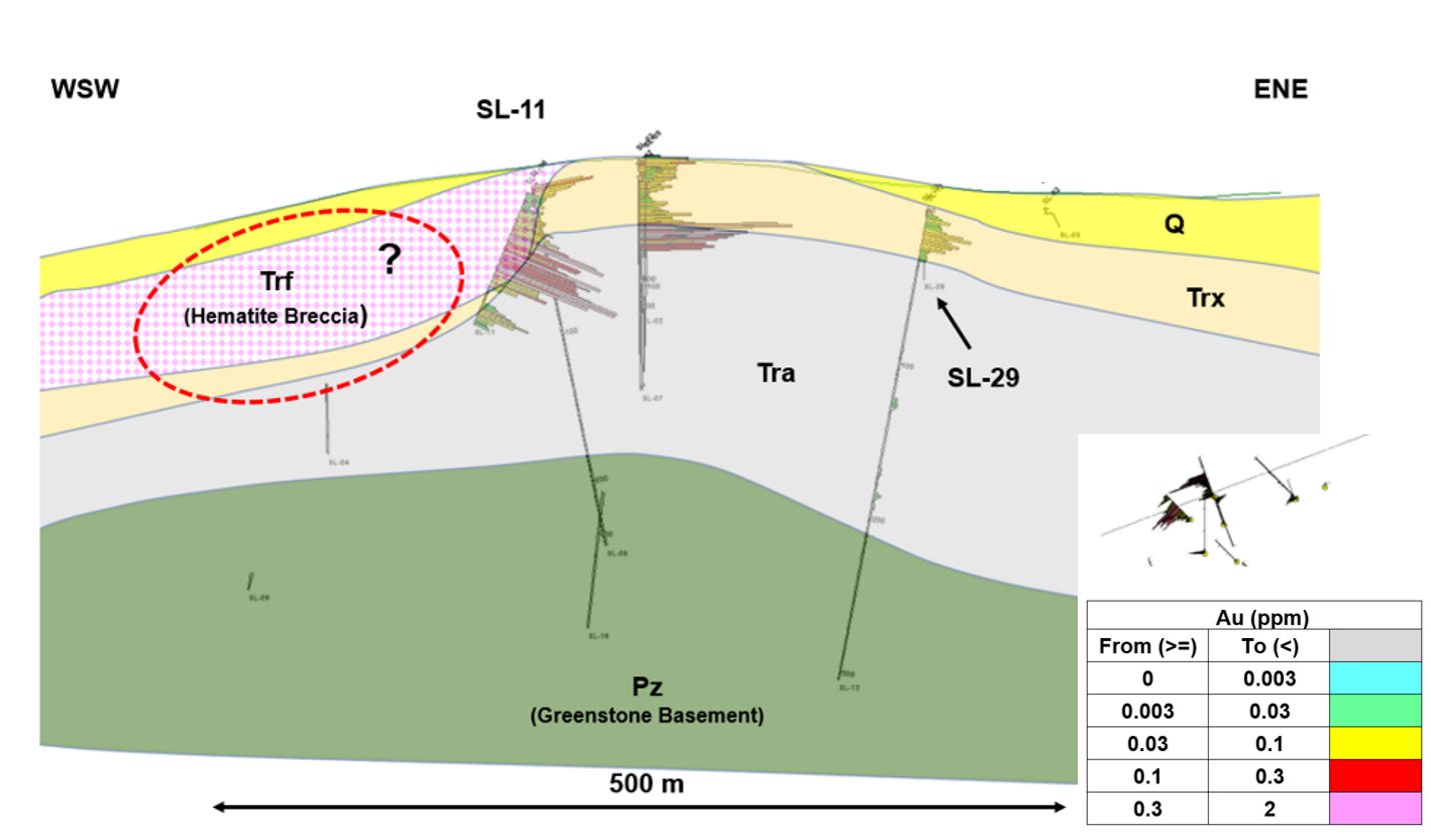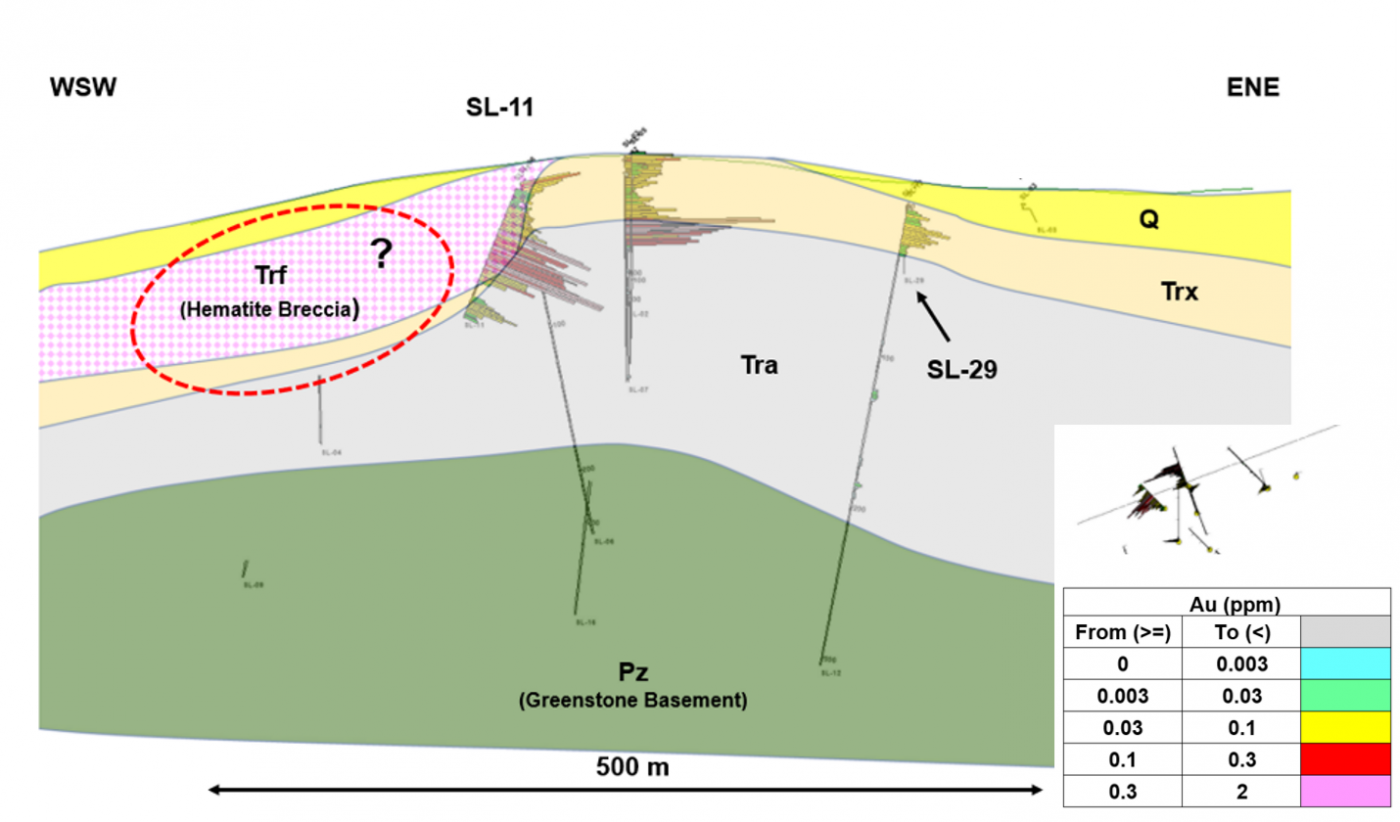 Figure 4 – Cross-section A-A’ with gold intercepts on interpreted geology.