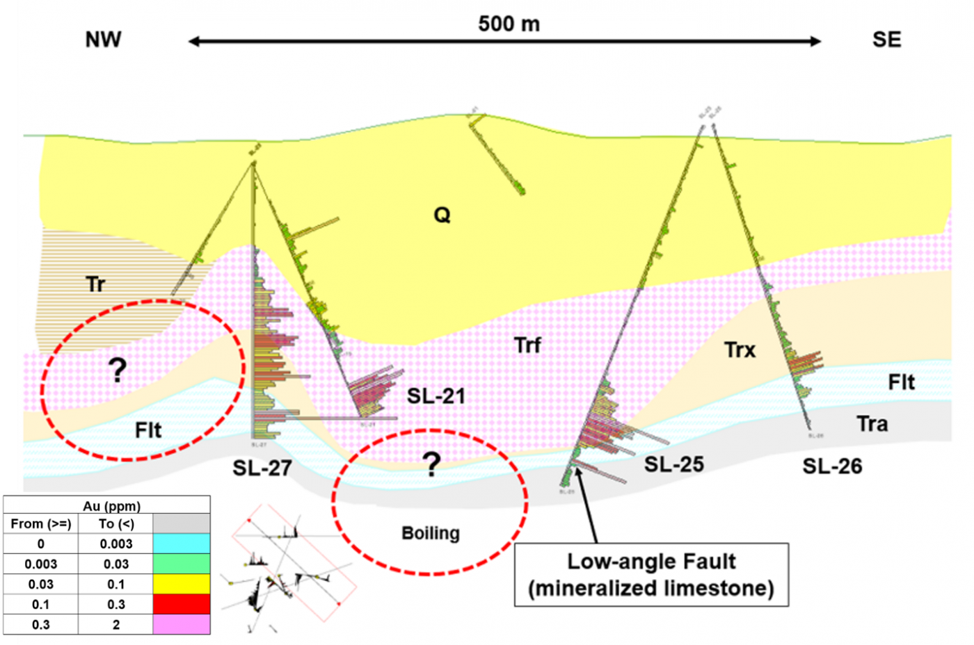 Most of the gold mineralization occurs in hematite breccia (Trf) and the underlying silicified lithic tuff zone (Trx), gold values can increase when intercepted by quartz veining. Important to know that drilling has also encountered displaced decalcified, gold-bearing (up to 0.64 g/t Au) carbonate rock in low-angle structures, which suggests that there can be more targets within the area as expected!