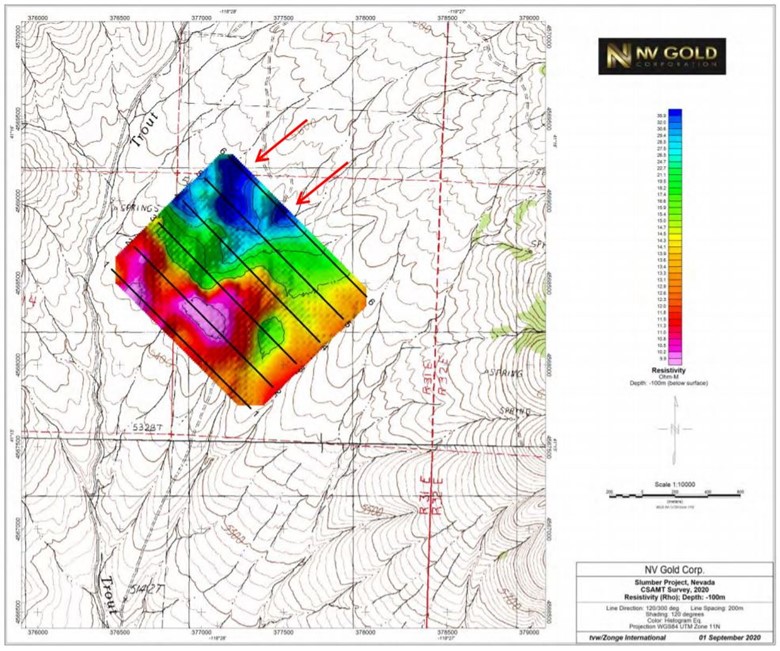 The first two drilling campaigns focused on a “Sleeper-like” model and targeted a small, silicified, and mineralized area in the middle part of the Property. However, the early drilling did not meet the desired high-grade structure but intercepted some zones of low-grade-oxide gold along the northern limits of the drilled area. In 2021 NV Gold did reinterpret this marginal zone of mineralized silicification by using older CSAMT data and a recently conducted IP survey to evaluate a wide-open resistivity zone and its correlation with gold mineralization to the north (see Figure 8 & 9). As a result, most of the 2021-2022 drill holes did meet significant thicknesses of low-grade-oxide gold distributed over an area of 800+ meters by 300+ meters with thicknesses more than 100-150 meters (see figures 3-7). Most holes are bottomed in gold mineralization, depth-limited by ongoing equipment challenges and ground water (see table 1).