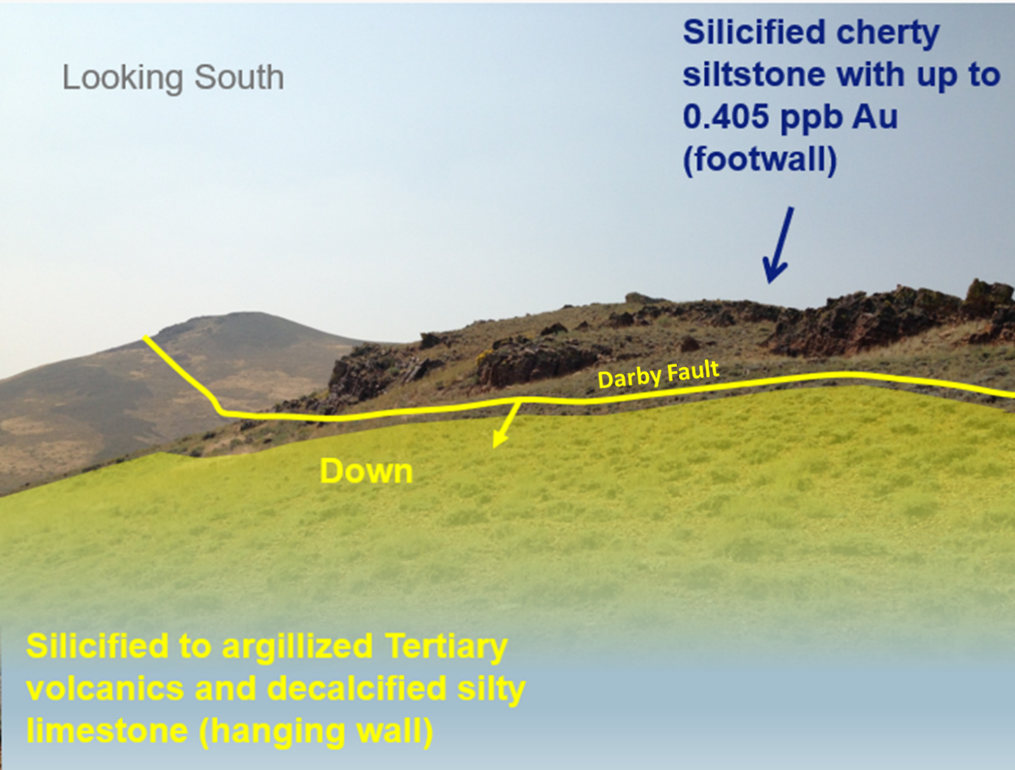 - Exposed rock types: Silicified, gold-anomalous cherty siltstone footwall to Darby Fault, and argillized, pyritic Tertiary volcanics and decalcified silty limestone, high in mercury (8.5 ppm), hanging wall to fault (see Figure 2 & 3).