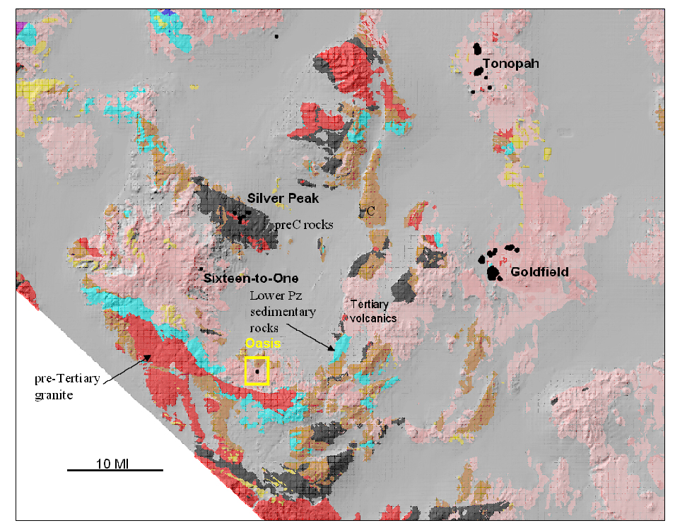 Regional geologic map showing location of Oasis Project in west-central Nevada; black dots/areas are productive/significant gold-silver deposits.