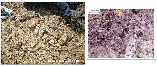 Exposures of “soft”, mineralized, potassically-altered volcanic or intrusive rock, with photomicrograph of disseminated hydrothermal biotite typical of porphyry Au-Cu systems.